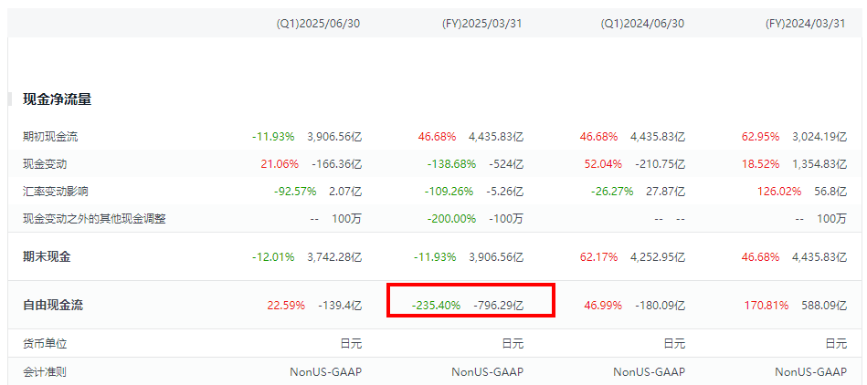 2025财年的“起跳” : 资本支出在2025财年(2024年4月-2025年3月)达到了-863.78亿日元的历史峰值,比2024年高出66%,更是2023年低谷的3倍。