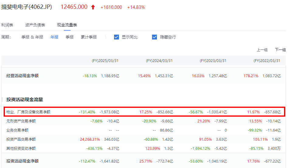 这正是上一张图看到的:在FY2025(2024/4至2025/3),资本支出(物业、厂房、设备)达到了-1,973亿日元的历史峰值。