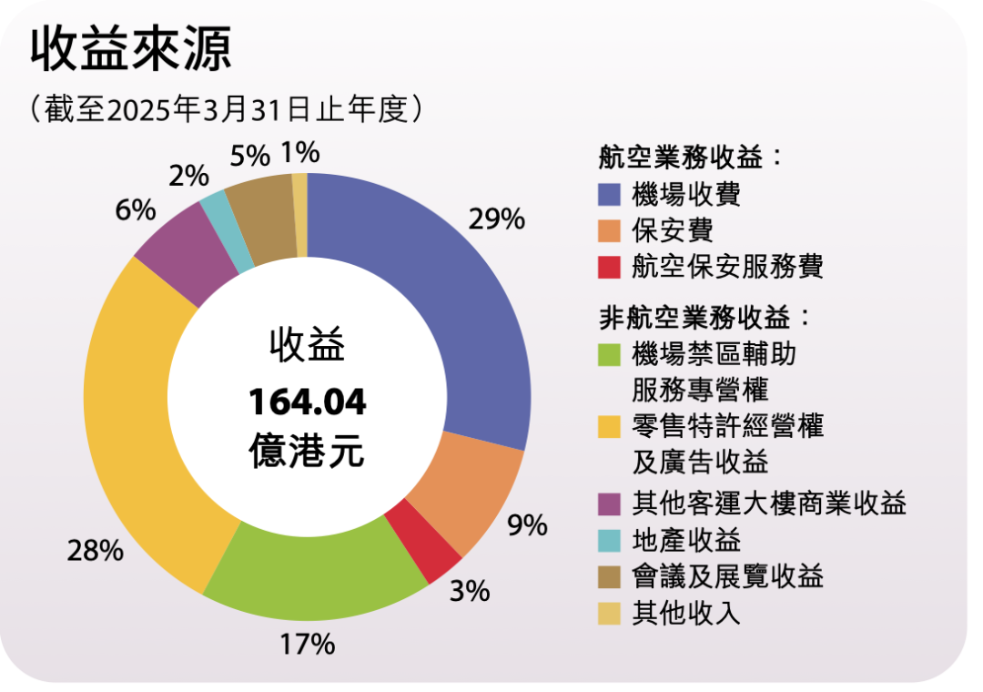 香港国际机场2024年财报中显示,其收益占比最大的为机场收费类目,比例为29%,其次为零售特许经营权及广告收益,比例为28%,两者基本持平。