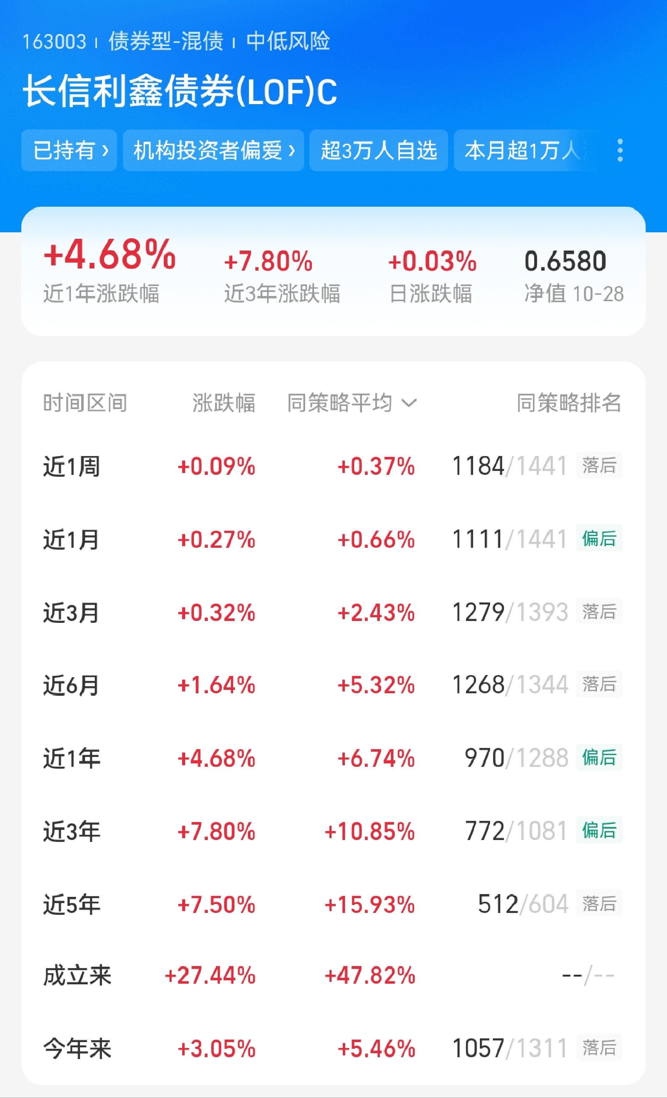 最近债市和股市同步回暖,所以以债基为底仓的固收+产品$长信利鑫债券(LOF)C(OTCFUND|163003)$开始了“天天红”模式,我目前持仓为3.6W,从业绩维度来看,近一周收蛋9个,近一月收蛋27个,近半年收蛋164个,近一年收蛋468个,收益曲线稳健向上,持有有小半年啦,体验不错,波动小,几乎不用操心涨跌,作为底仓特别 “四平八稳”。这一点也是深受机构偏爱的:C份额,机构持有占比96.66%,A份机构持有占比99.28%,两个份额的机构持有比例都高达9成以上,这在低波固收+中不多见,说明机构大佬们也是对风险与安全性有更多的考量的。从资产配置逻辑看,它的布局也很扎实,信用债占81.30%,利率债占9.39%,这两者提供了稳定的票息来源,利用5.45%的可转债进增厚收益,攻守平衡。近1个月最大回撤只有8个蛋,7天修复,回撤管理水平很突出。今天趋行权益行情合适继续发车5010.29元。