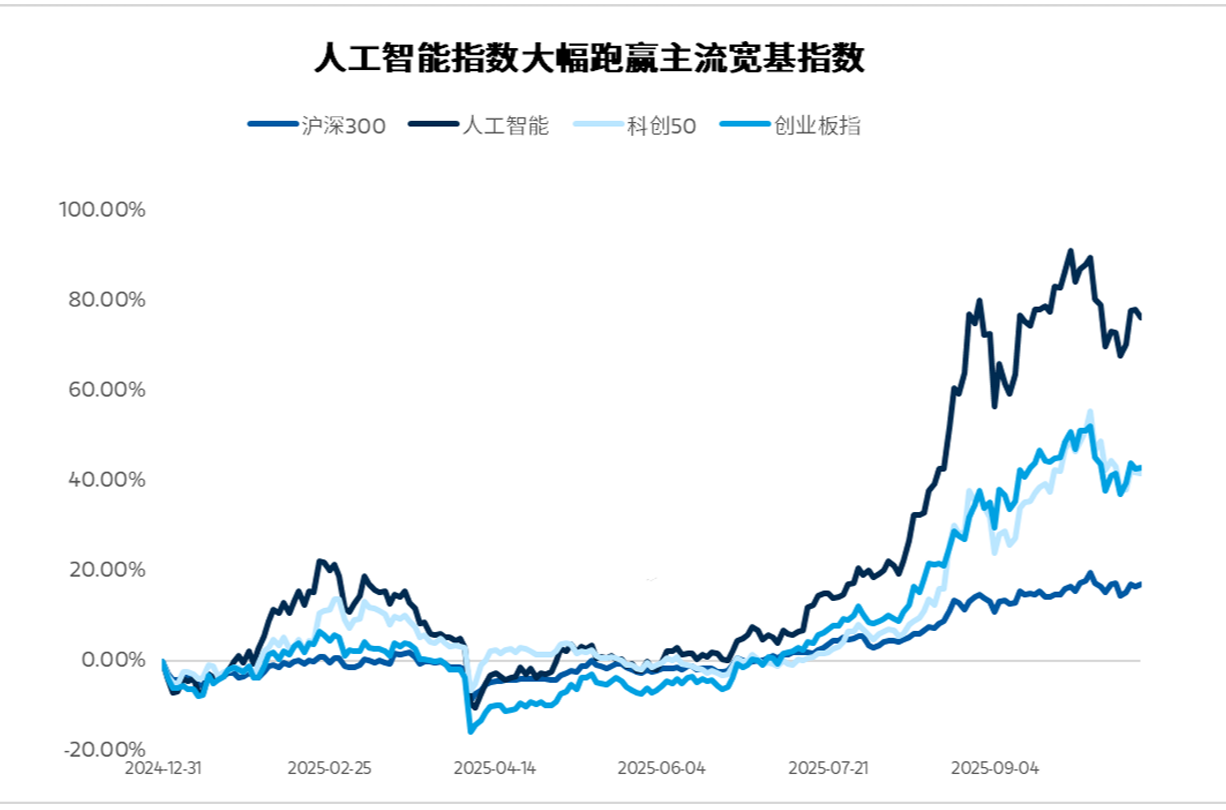 今年以来,科技产业的上涨以人工智能板块为首要代表,人工智能指数(931071)今年以来已上涨76.52%(数据来源:wind,截止2025.10.23),并大幅超越同期主流宽基指数。