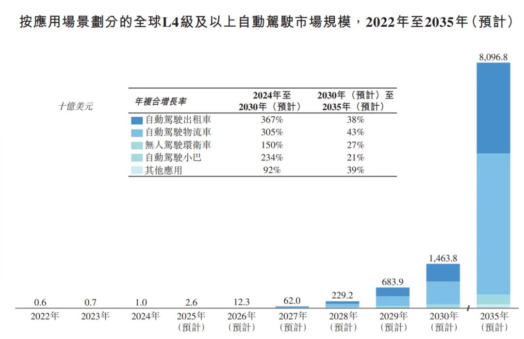 于2024年,全球L4级及以上自动驾驶市场规模为10亿美元,预计到2030年将达到14,640亿美元,2024年至2030年的年复合增长率为238%,到2035年将进一步达到80,970亿美元,2030年至2035年的年复合增长率为41%。