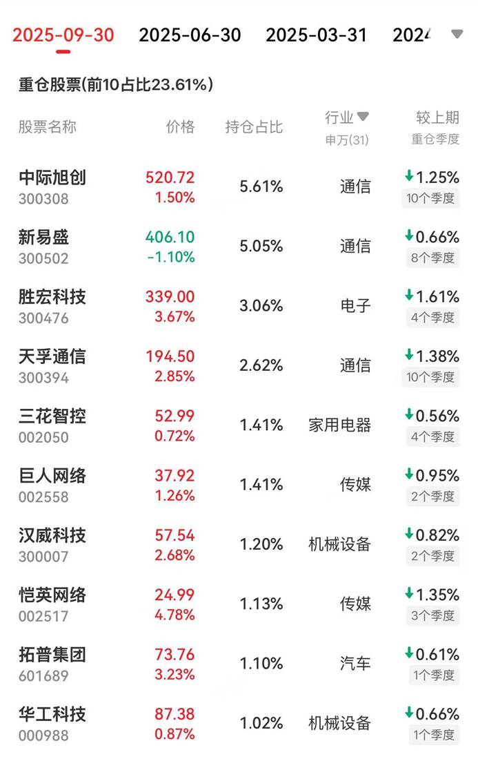 以最受关注的华商润丰为例,三季度收益48.50%,截至三季度末近一年收益110.75%。冲锋还是挺犀利的,长期重仓易中天这种海外算力股,但集中度明显在降低,前十占比只有23.6%,重仓股持仓占比也都在下降。