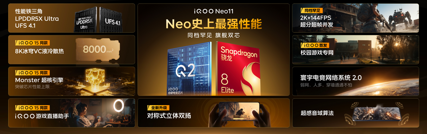 iQOO Neo11搭载以骁龙8至尊版、LPDDR5X Ultra(9600)和UFS 4.1组成的“性能铁三角”,安兔兔综合跑分超过354万分,刷新同平台性能记录;骁龙8至尊版与自研电竞芯片Q2构成“旗舰电竞双芯”,在iQOO15同款Monster超核引擎支撑下,带来Top级手游更好的1% Low帧表现、全新升级的PC级2K纹理超分、原生级144FPS无损超帧以及2K + 144FPS超分超帧并发等先进技术,成就业内领先的更稳、更清晰、更流畅的游戏体验,并实现40+款手游的原生144FPS以及海量游戏的超分超帧适配,还与数款Top游戏实现官方合作与联合调优,挑战同档最强游戏视效。