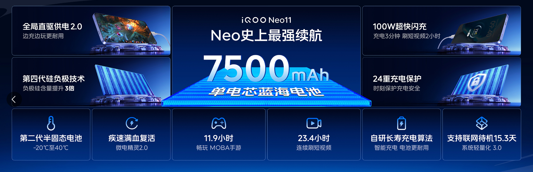 续航方面,Neo11 实现 Neo 史上最强续航表现,搭载配备了第二代半固态电池技术和第四代硅负极技术的7500mAh超薄蓝海电池,即使在-20℃ ~ 40℃的环境中,依然能稳定持久放电,并配备100W超快闪充且支持PPS和PD快充协议,让充电更自在;全新升级的全局直驱供电2.0,支持智能温控,做到发热更低、损耗更少,有效延缓电池老化。
