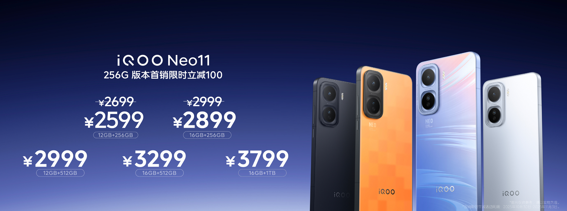 iQOO Neo11 共有 5 个版本可供选择,12GB+256GB 版本售价 2699 元(首销限时到手 2599 元);16GB+256GB 版本售价 2999 元(首销限时到手 2899 元);12GB+512GB 版本售价 2999 元;16GB+512GB 版本售价 3299 元;16GB+1TB 版本售价 3799 元。