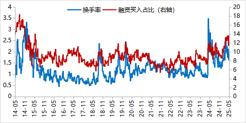 本周市场风险偏好有所回升;日均换手率持续回落至1.64%;全A成交保持在1.7万亿左右,融资交易占比升高至13.59%,较前值回升。