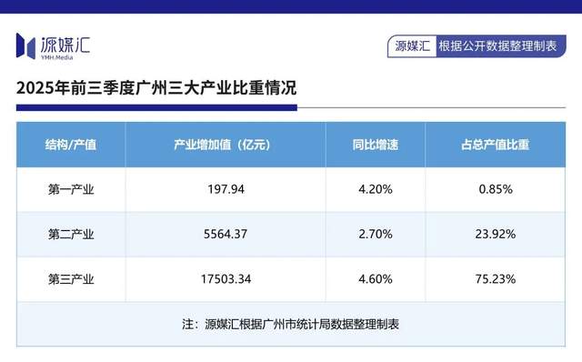 10月30日,广州市统计局发布数据显示,2025年前三季度(下称“前三季度”),广州地区生产总值23265.65亿元,同比增长4.1%。其中,第一、第二以及第三产业增加值均呈现出不同幅度上涨。