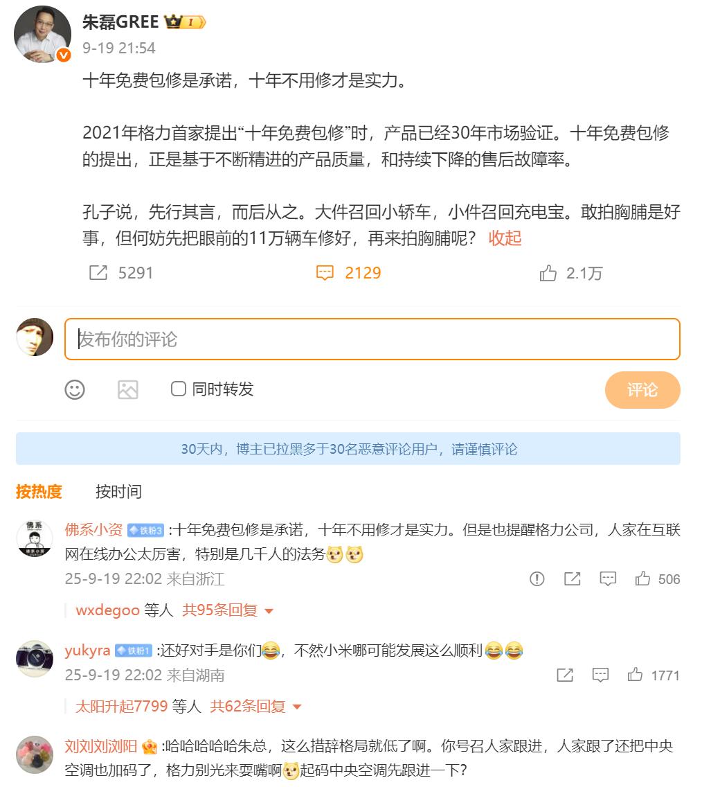 9月,小米宣布空调推出10年免费包修服务,格力高管朱磊发文嘲讽称:“大件召回小轿车,小件召回充电宝,敢拍胸脯是好事。先把眼前的11万辆车修好,再来拍胸脯呢?”或暗指小米此前召回11.6万辆SU7标准版电动汽车。被网友质疑情绪化回应,朱磊还强调“制造业是实干干出来的”,批评小米转发“似是而非的信息”。