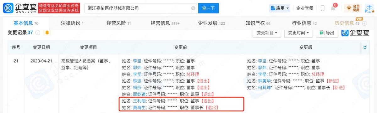 此外,黄海生和海圣医疗的董事、副总、核心技术人员王利明也曾分别在嘉佑医疗任董事长、监事。海圣医疗从嘉佑医疗退股后,二人于2020年4月退出嘉佑医疗的高管名单。据北交所信披准则,招股书应披露董监高的职业经历(包含曾担任的重要职务及任期),不知二人在嘉佑医疗的任职经历为何未被招股书披露。