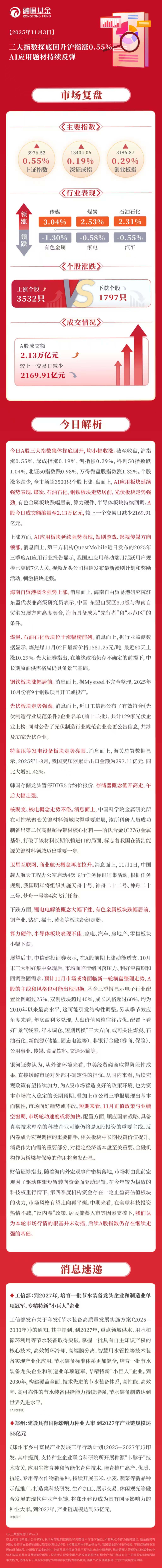 今日A股三大指数集体探底回升,均小幅收涨。截至收盘,沪指涨0.55%,深成指涨0.19%,创指涨0.29%,科创50指数跌1.04%,北证50指数跌0.98%,万得微盘股指数涨1.32%。个股涨多跌少,全市场超3500只个股上涨。
