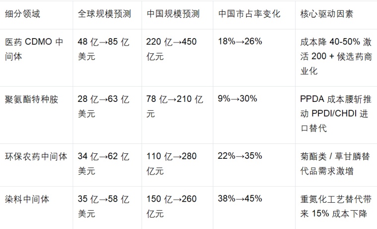 核心逻辑:技术突破使供给端成本曲线下移 30-50%,激活原本因成本过高的 “沉睡需求”(如廉价抗癌药、军工级聚氨酯),同时开拓新场景(如可降解染料、高端香料)。
