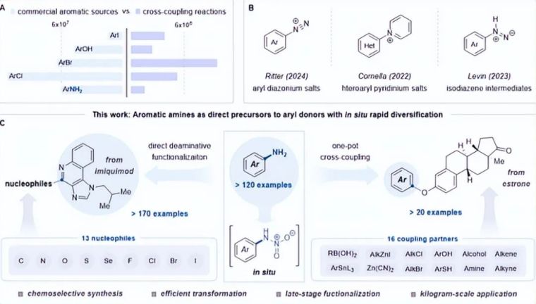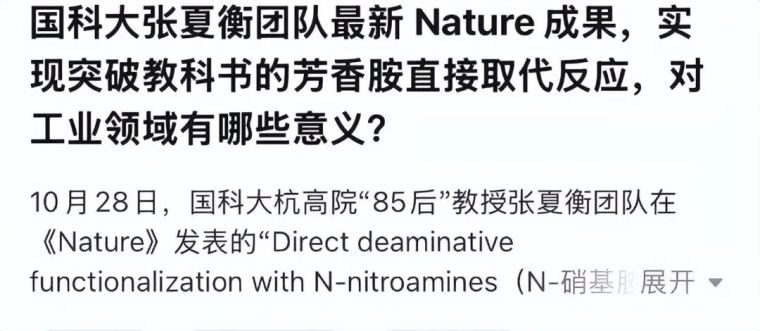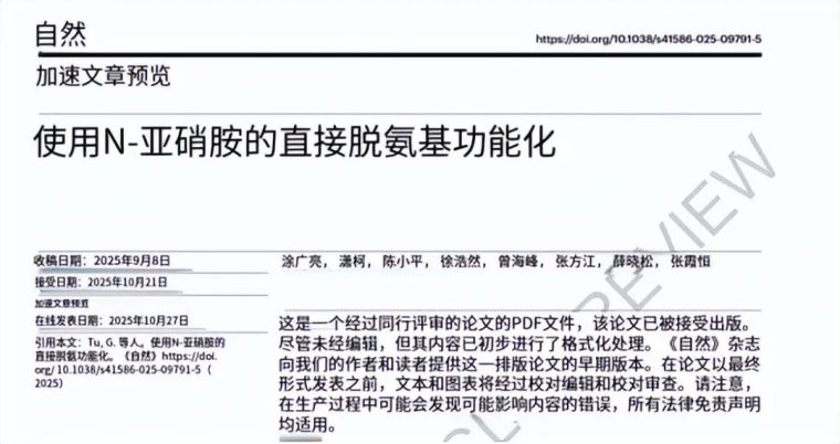 2024年10月28日,国科大杭高院张夏衡团队的研究成果《N-硝基胺介导直接脱氨官能团化》登上《Nature》,获得了国际学术界与产业界的顶级认可。这项技术的核心价值在于,它彻底绕过了沿用140年的传统重氮化反应。