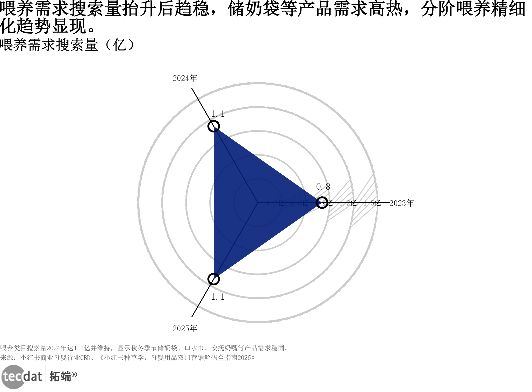 3秒解读:喂养搜索量2023-2024年涨37.5%,2024-2025年持平,细分品类中“储奶袋”“分阶奶瓶”需求爆发,传统品类下滑。