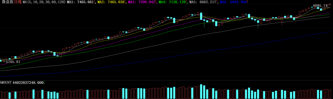 今天意外的是微盘股指数还上涨了0.17%,微盘股是比中证2000指数更低一个层级的概念指数,目前没有相应的指数ETF,属于典型的袖珍型微小盘品种,多数是游资而非机构投资者关注的方向,这个指数今天创见出了新高至8095点。