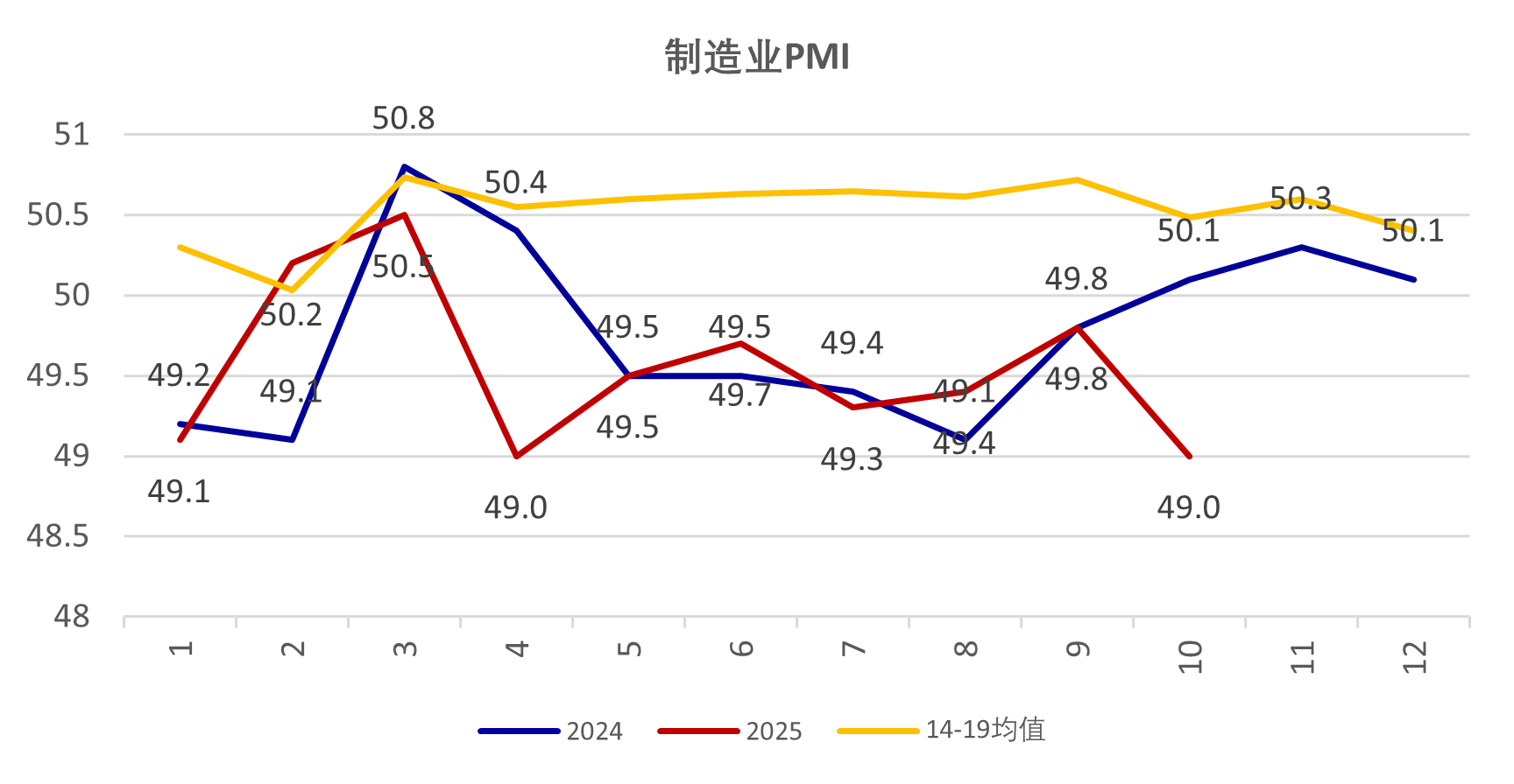 统计局公布了国内10月份的PMI数据,10月制造业PMI49%(前值49.8%),环比下降0.8个百分点,非制造业PMI50.1%(前值50%),环比回升0.1个百分点,综合PMI产出指数50%(前值50.6%),环比下降0.6个百分点。十月份PMI数据阶段性回落,主要是受到中美关系的影响,贸易摩擦对工业企业的生产造成的影响较大,从PMI的分项数据也可以观察到迹象。PMI新出口订单从上月的47.8%回落至45.9%,而订单PMI的降幅为0.9个百分点,出口的拖累更大。受此影响,生产和采购PMI也分别下滑了2.2和2.6个百分点。此外市场还受到库存周期的影响。