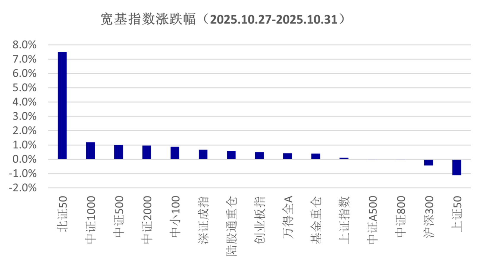 上周A股市场整体走势呈现冲高回落,中美关系牵动投资者情绪,上市公司三季报在微观层面,对市场基本面预期进行验证。指数方面分化较大,宽基指数中北证50指数周涨幅达到7.5%,中证1000和中证500指数小幅上涨了1.2%、1.0%,而上证50指数和沪深300指数下跌了1.1%、0.4%,市场呈现出小盘股行情特征。市场成交额回升,万得全A的日均成交额为2.33万亿,较上一周的日均1.80万亿明显回升,反应市场博弈热情。
