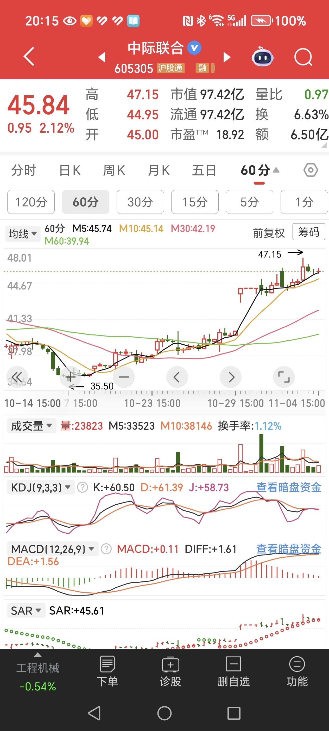 中际联合,这支票主升浪迟迟不来,昨天利用调整45元参与了一下,今天盘中冲高出掉。六十分钟K线图,MACD有钝化。现在的市场还是保障资金的安全为第一位。