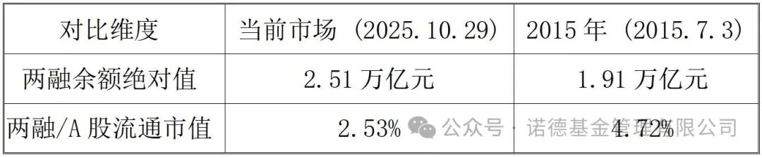 Wind数据显示,截至10月29日,A股两融余额报2.51万亿元,10月以来始终维持在2.4万亿元以上。当前两融余额占流通市值比例为2.53%,处于近十年中位水平,远低于2015年7月3日4.72%的高点。