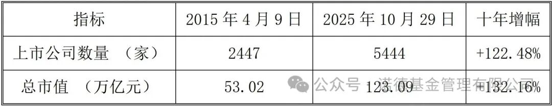 从市场容量看,A股上市公司的数量与总市值均已实现跨越式增长,市场深度与广度显著提升。据Wind数据,截至2025年10月29日,A股上市公司数量较2015年4月9日的2447家跃升至5444家,增幅达122%;总市值则从53万亿元扩张至123万亿元,增幅高达132%。