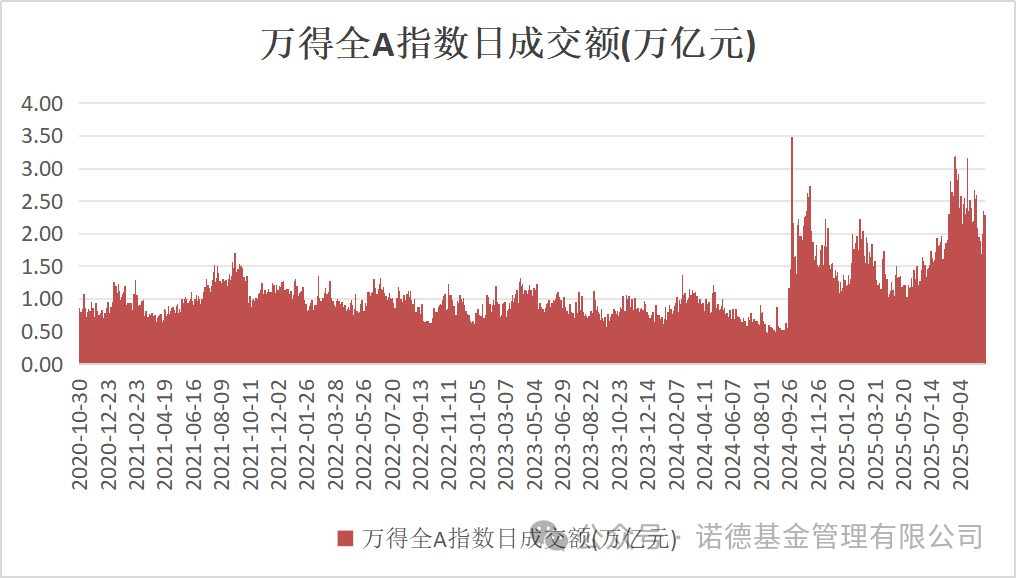 Wind数据显示,今年以来A股市场成交额显著扩张,截至10月29日,万得全A指数的日成交额为2.29万亿元,已连续128个交易日高于1万亿元。