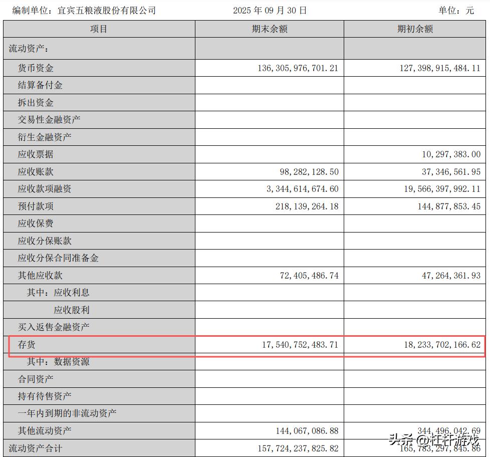 2025年三季度末,五粮液的库存存货仍处于历史高位:存货账面价值175.41亿元,虽较年初略有下降,但绝对数额依然庞大。去库存是五粮液乃至整个行业当前最紧迫、最艰难的任务。