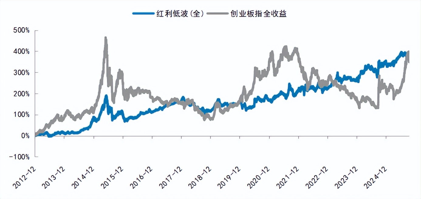 图:红利低波指数与创业板指的长期累计收益比较(全收益)
