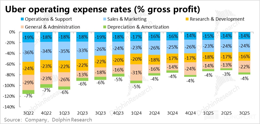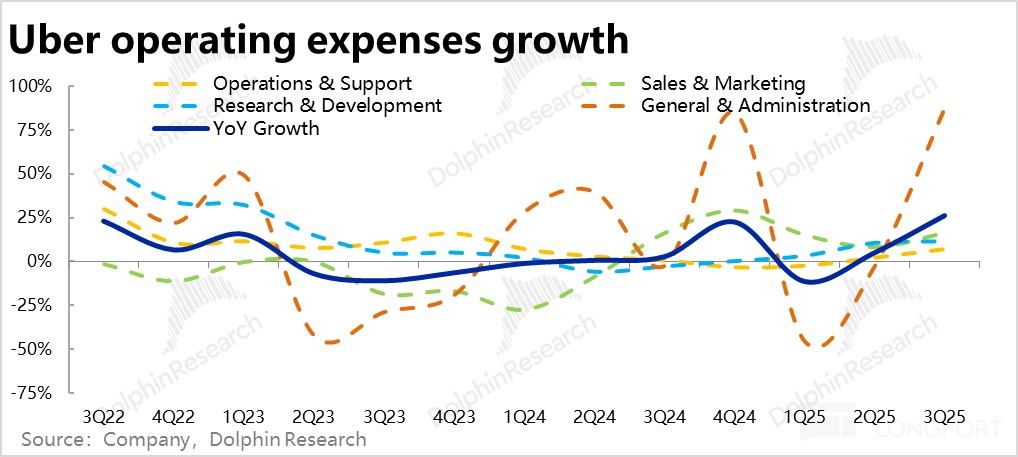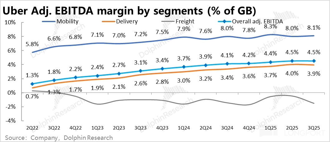 在毛利率基本停止提升,同时费用支出增速大幅抬头的情况下,本季 Uber 的利润表现不算超预期的出色。调整后 EBITDA 本季约 22.6 亿,虽同比增长 33.5%,但仍小幅跑输预期。利润率(占订单额比重)为 4.54%,同比提升仅 41bps,利润率提升幅度是 22 年以来的最低值。