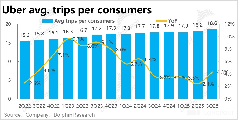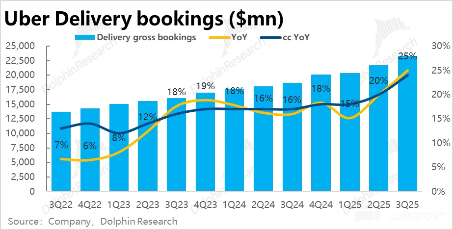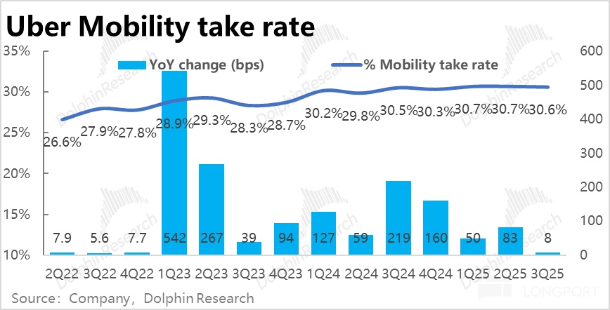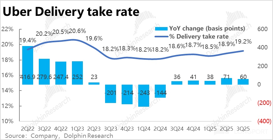 而外卖业务的变现率则继续走高,在不低基数下仍同比提升约 60bps。带动配送业务的收入增速环比明显提速了 4pct 到 29%,强于订单额增速。应当主要是Uber 在广告上变现的贡献。