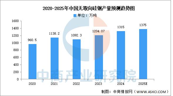 中商产业研究院发布的《2025-2030年中国取向硅钢分析及发展趋势研究预测报告》显示,近年来,我国取向硅钢产量持续增长,2023年取向硅钢产量为265.02万吨,占硅钢产量的17.35%。截至2024年底,我国取向硅钢实际产量为295万吨。中商产业研究院分析师预测,2025年中国取向硅钢产量将达335万吨。