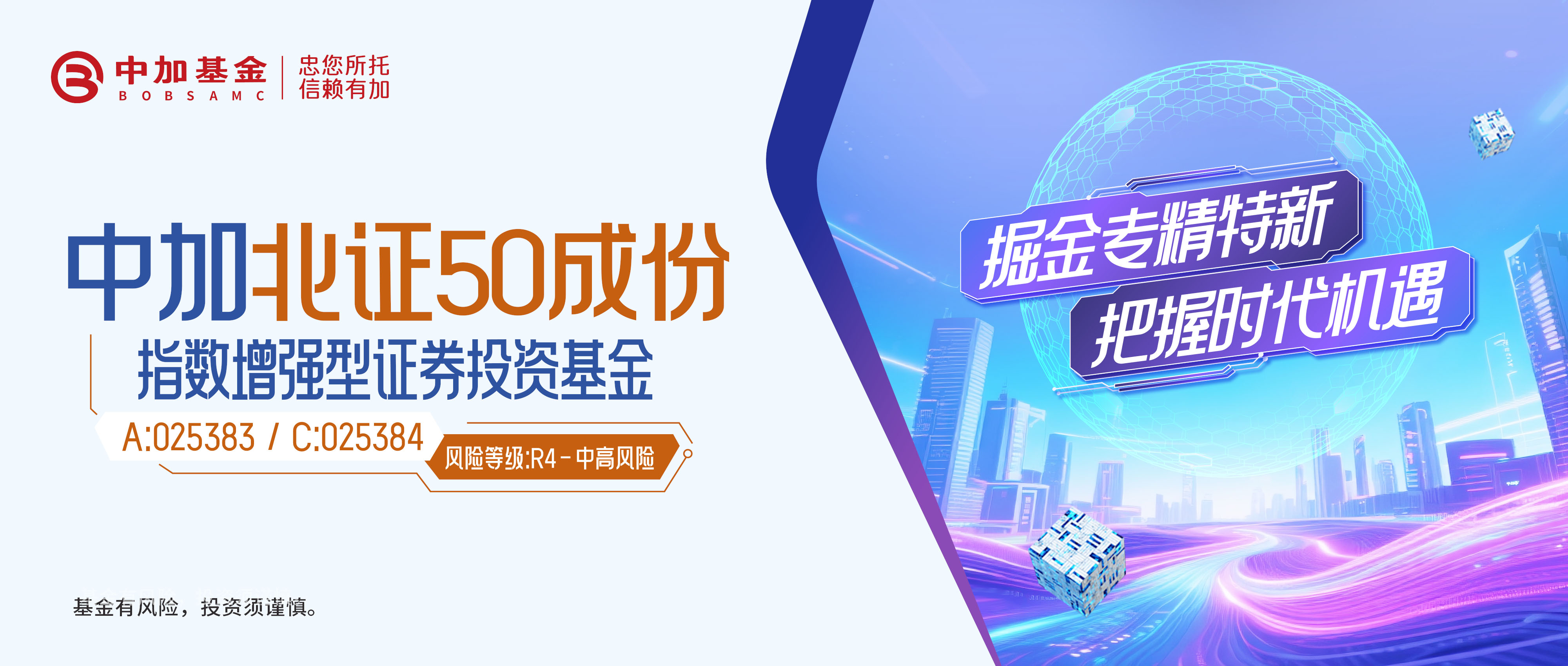 中加基金顺势推出——中加北证50指数增强基金(A类:025383,C类:025384),在紧密跟踪指数的基础上,通过量化增强策略,力争获取超越指数的长期回报。