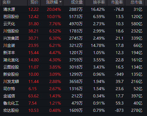 磷化工板块盘中异动拉升,清水源盘中直线拉涨停,芭田股份涨停,云天化、川恒股份、川金诺等跟涨。
