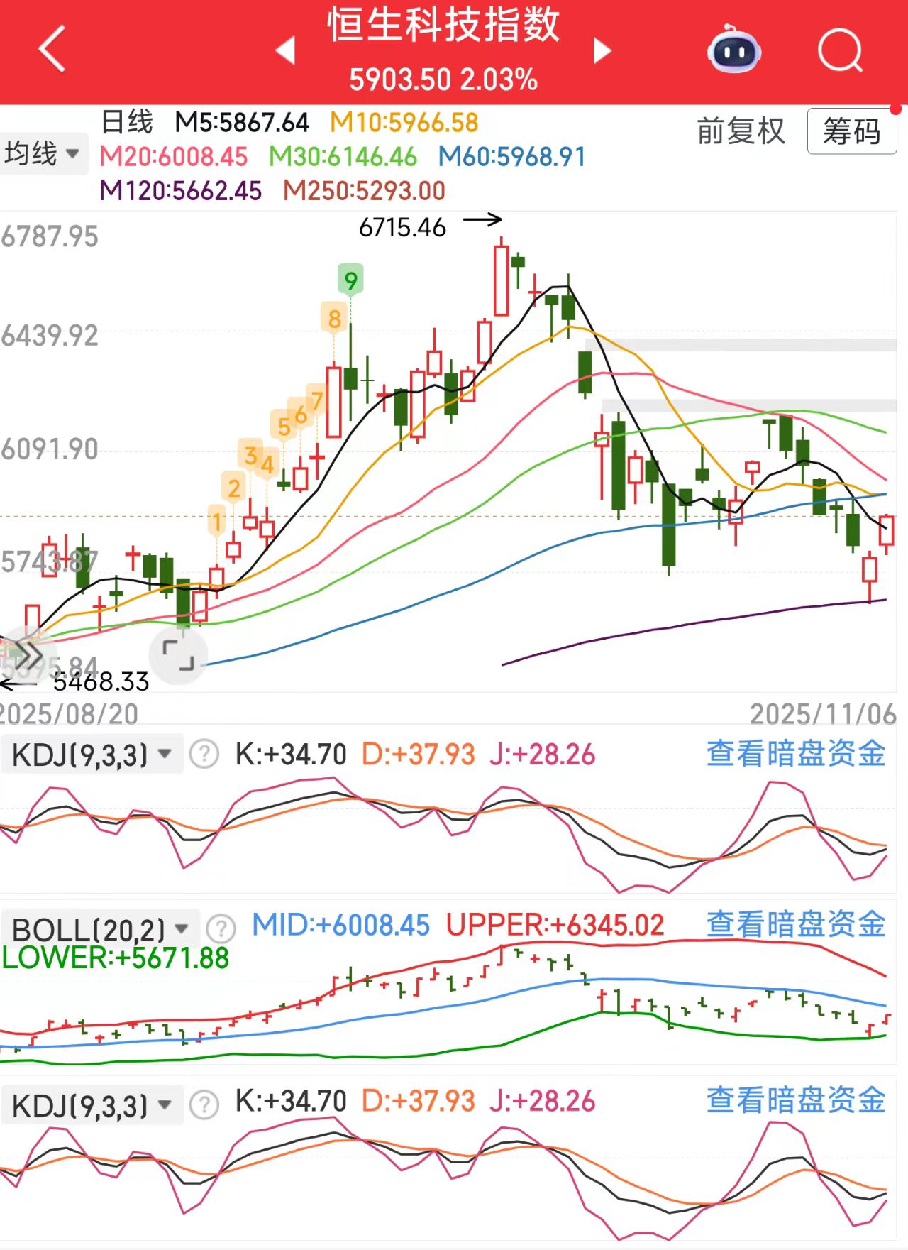关键看11月中下旬的外部信号,中美贸易协定执行、稀土出口节奏这些能不能顺利推进,要是能谈拢,港股情绪会明显好转。技术面现在确实偏弱,均线全压在指数上面,MACD绿柱还在拉长,但超卖区可能触发小反弹。不过别指望大反转,震荡磨底是大概率。我的思路很简单,先别急着抄底,等11月政策面有实质进展再动手,如果中美那边传来好消息,可以分批上科技板块。