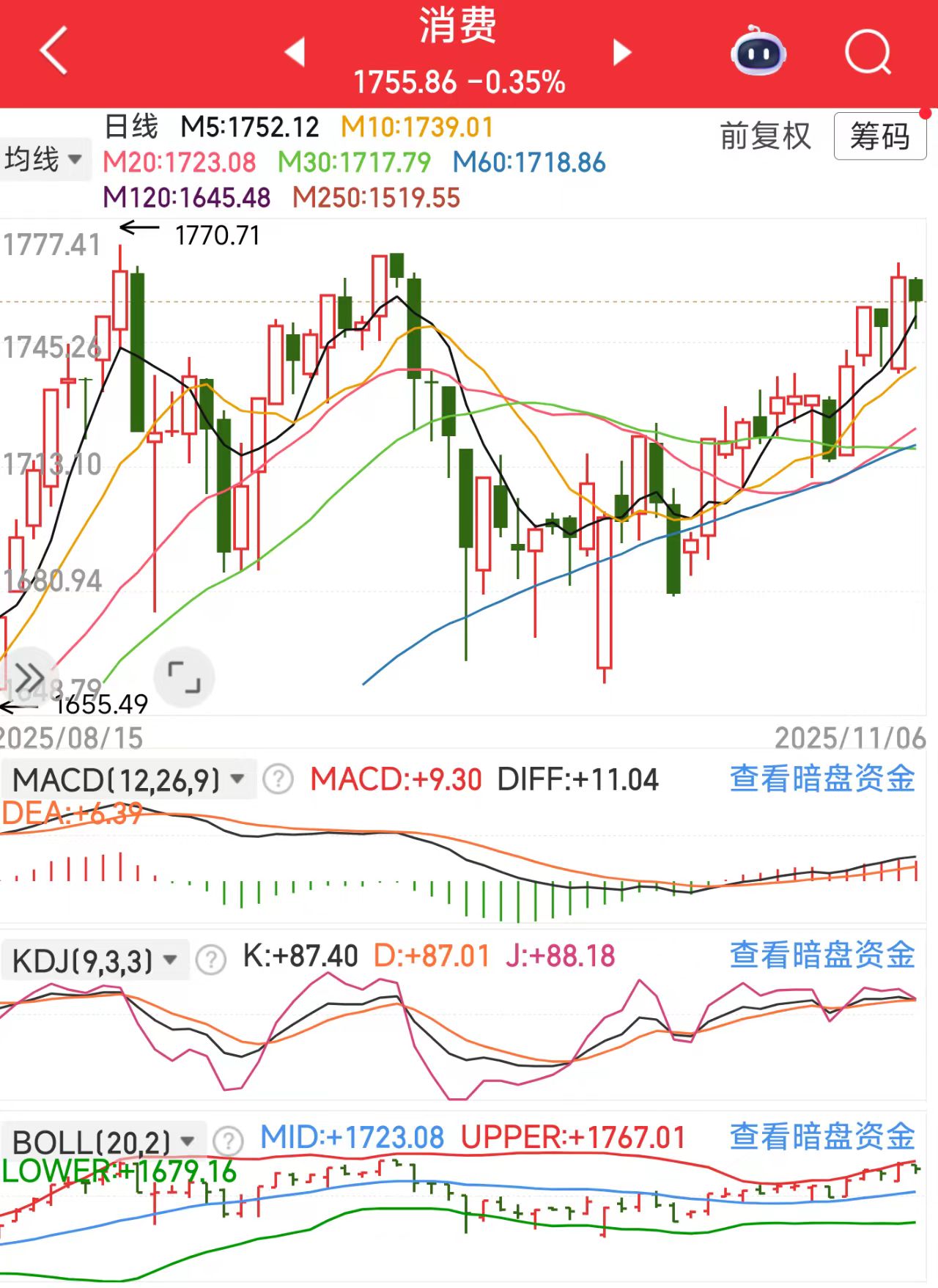 从投资角度看,消费板块现在估值很低,PE才20倍左右,比之前跌了一半,政策支持+消费回暖,虽然技术面消费指数的短期KDJ指标有点高,可能会有回调,但消费这根支柱稳得很,我觉得是时候布局了,政策红利实实在在,消费趋势也跑得稳,这波机会不能错过。