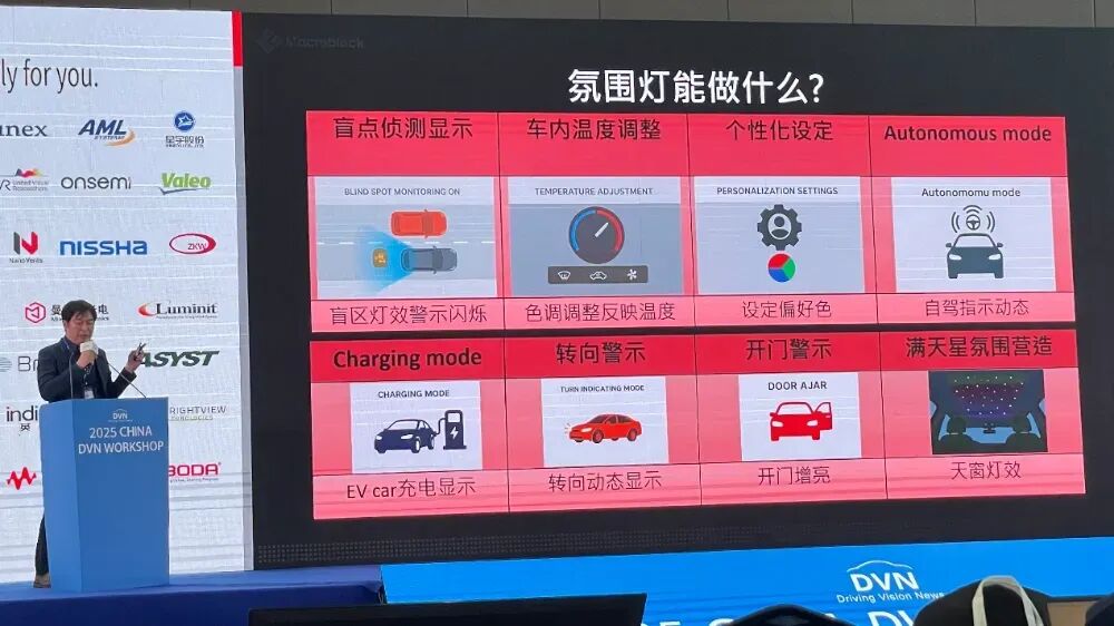 静态氛围灯可以透过颜色变化传递信息,但动态氛围灯可以提供更多应用可能性,透过智能控制动画效果、对灯光颜色、亮度、反应速度精准控制,为车辆营造氛围、传递讯息、显示警告和有效展示汽车品牌,应用范围从个人信息传递 (音乐律动、来电提醒),以视觉反馈机制扩大至先进驾驶辅助系统 (ADAS),如盲区侦测 (BSW)、后方交通警示 (RCTA)、车道变换辅助 (LCA)、后方防追撞警示 (RECW)、下车开门警示 (DOW)、驾驶监控 (DMS) 等,甚或是自动驾驶 L3 及以上 (青蓝色 LED)。