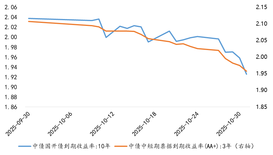 10月份,央行通过超额续作MLF和买断式逆回购,持续呵护流动性,资金面整体偏宽松,全月DR007利率均值为1.50%。本月债市呈现回暖表现,尤其是在月末央行宣布重启国债买卖后大幅走强,其中长端利率明显下行,信用利差较大幅度压缩,1年期同业存单收益率下行4bp。图1 2025年10月债市走势