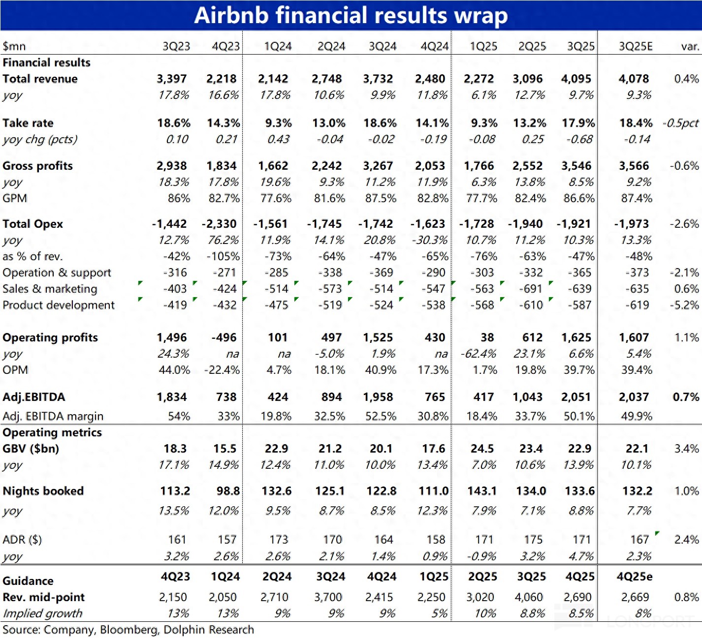另类住宿龙头 Airbnb爱彼迎,于 11 月 7 日早美股盘后,公布了 2025 财年 3 季度财报,整体来看,虽然因变现率不及预期,财务指标上有好有坏,利润率收缩的问题也仍在。但更重要的经营指标增长双双环比提速,对于下季度 GBV 增速的指引也同样好于预期,看起来预示着业务增长终于有触底反弹的趋势。具体来看: