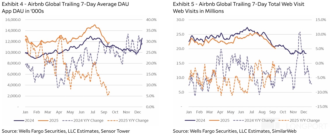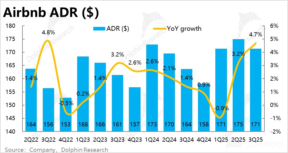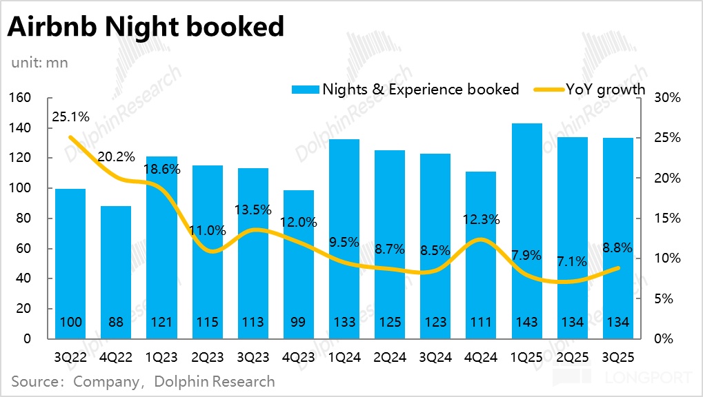 更重要的量--总间夜预定量本季同比增速达 8.8%,较上季加速了 1.7pct,同样好于市场预期。虽然可以说超预期幅度不算大,但考虑到业绩前 AirDNA 等高频数据给出的信号并不算乐观,因此仍可谓超预期的重要方向性拐点。