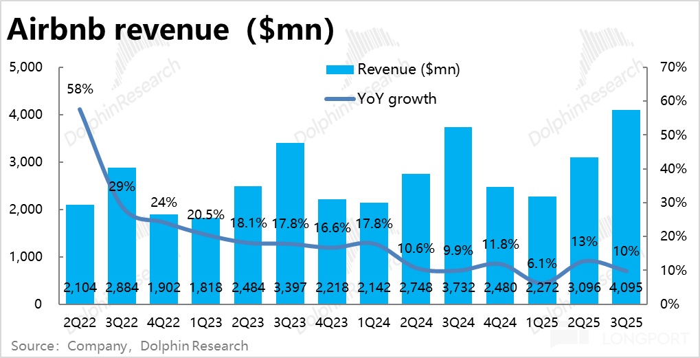 在此拖累下,本季 Airbnb 的营收同比增长 9.7%,跑输 GBV 增速,且也是只是大体符合预期了。
