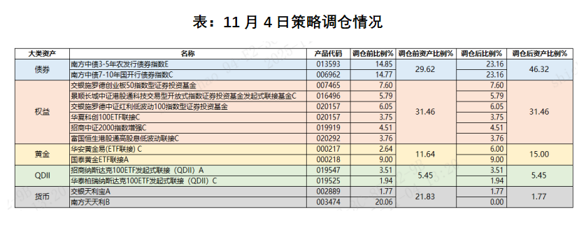 在此背景下,交银基金投顾主理团队于11月4日对交银多元资产优选策略进行调仓。