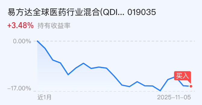$易方达全球医药行业混合(QDII)C$继续调仓11K,另外加仓4K,总计15K。还是这个是我的小甜甜,创新药已经经历了相当充分的调整了,今天再度走低,创新药最近确实不行。但是我认为现在这个节奏是为下一波行情去蓄力。从9月份之后,到现在已经调整了2个月的时间了,无论是从时间还是空间上已经相当的充分了,今天继续跌,那我就继续怼的事情。创新药已经调整的非常的充分了,现在就是等的事情了。