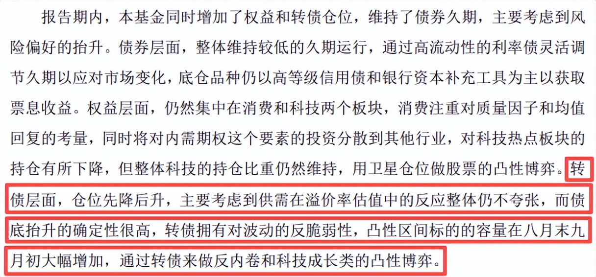 原因嘛,他在三季报中说:一是可转债的估值整体还不夸张;二是可转债拥有对波动的反脆弱性,凸性区间标的的容量在八月末九月初大幅增加,他要通过可转债来做反内卷和科技成长类的凸性博弈。