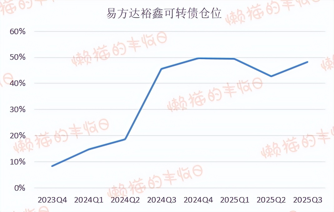 易方达裕鑫的可转债仓位在2024年1季度被从8.4%提到14.82%,之后也持续提升,2024年3季度加到45.49%,并在之后的几个季度中始终保持在40%+的位置。