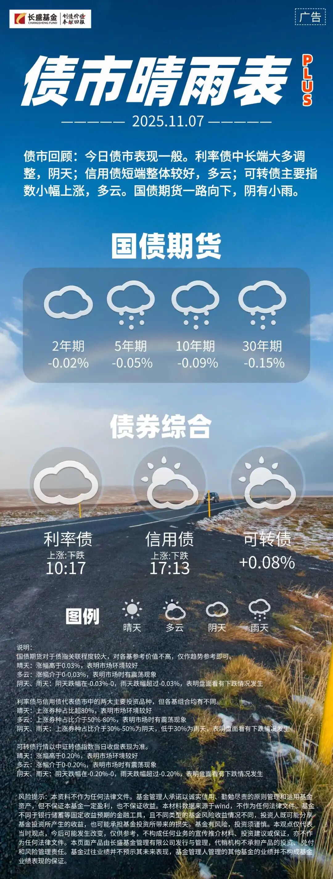 债市回顾:今日债市表现一般。利率债中长端大多调整,阴天;信用债短端整体较好,多云;可转债主要指数小幅上涨,多云。国债期货一路向下,阴有小雨。