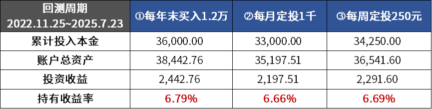 从2022年11月25日-2025年7月23日的回测数据中发现,三种模式下账户的收益率差别细微,而主要的差异体现在累计投入本金与账户总资产。