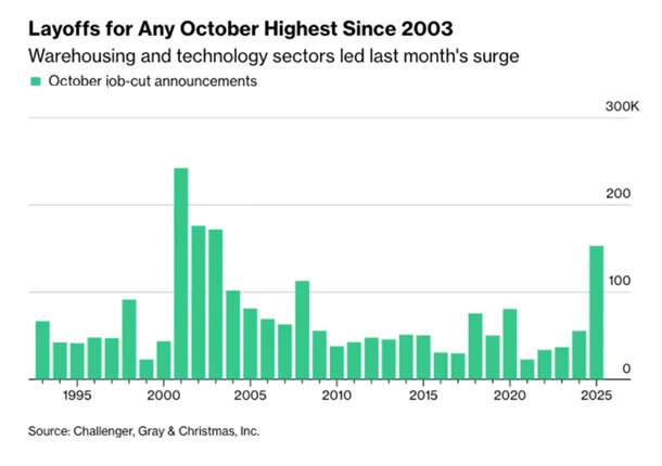 3、美国企业10月裁员规模创20多年来同期最高,人工智能变革冲击就业市场。据Challenger, Gray & Christmas Inc.的数据显示,随着人工智能重塑行业格局以及成本削减加速,美国企业10月份宣布的裁员规模是二十多年来同期最高水平。美国企业上个月宣布的裁员人数为153,074人,几乎是去年同期的三倍,主要集中在科技和仓储行业。该公司首席营收官表示,这是自2003年以来的10月裁员最高纪录,当时手机的出现也带来了类似的颠覆性影响。(数据来源:华尔街见闻,2025.11.6)