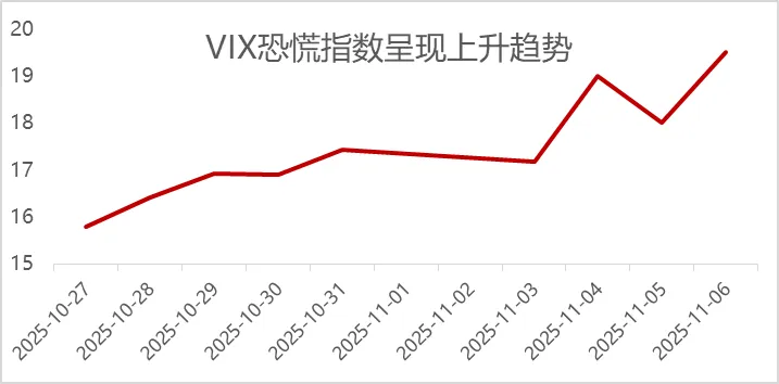 从市场情绪指标来看,VIX恐慌指数从10月底以来持续上升,昨晚更是大幅收涨超8%,体现出市场对美股的情绪愈发紧张。(数据来源:Wind)