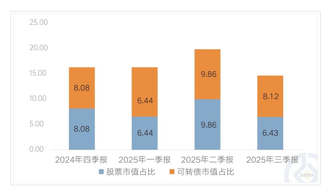 二级债基的属性决定了富国裕利可以直接参与股票投资,通过股票+可转债的配合,能够更加灵活地进攻。近一年来,富国裕利债券的股票与可转债的市值合计占比基本围绕着15%波动,同时也保持了对于债券资产80%以上的投资比例,较好地兼顾了进攻和防守。截至三季度末,富国裕利A近一年净值增长7.62%,大幅跑赢同期3.55%的业绩比较基准。