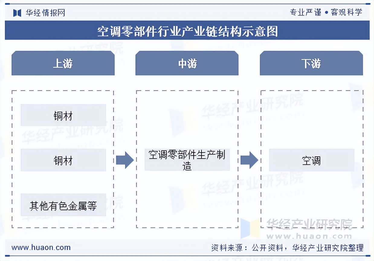 空调零部件的上游原材料供应商、中游空调零部件制造商及下游应用。上游原材料供应商主要生产的原材料主要包括铜材、钢材及其他有色金属。中游空调零部件制造商主要生产各种零部件。下游应用主要包括家庭及商业应用,其中家庭应用主要包括家用空调、冰箱等,而商业应用则主要包括商用空调、冷链物流制冷系统及数据中心制冷系统等。