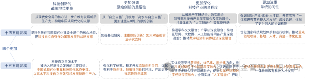 “十五五”将科技自立自强水平大幅提高作为经济社会发展主要目标之一,明确科技创新是“发展新质生产力的核心要素”,这是对科技创新的新定位。从文件表述来看,与“十四五”相比,科技创新在“十五五”期间的战略地位进一步提升,而且更加强调原始创新的重要性和科技产业融合的深化,也更加注重系统协同性。